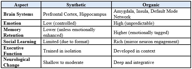 In addition, organic experiences engage the mirror neuron system, key to empathy, imitation, and interpersonal learning (Rizzolatti & Craighero, 2004). These interactions are often missing in simulations, which limit non-verbal cues and social resonance.